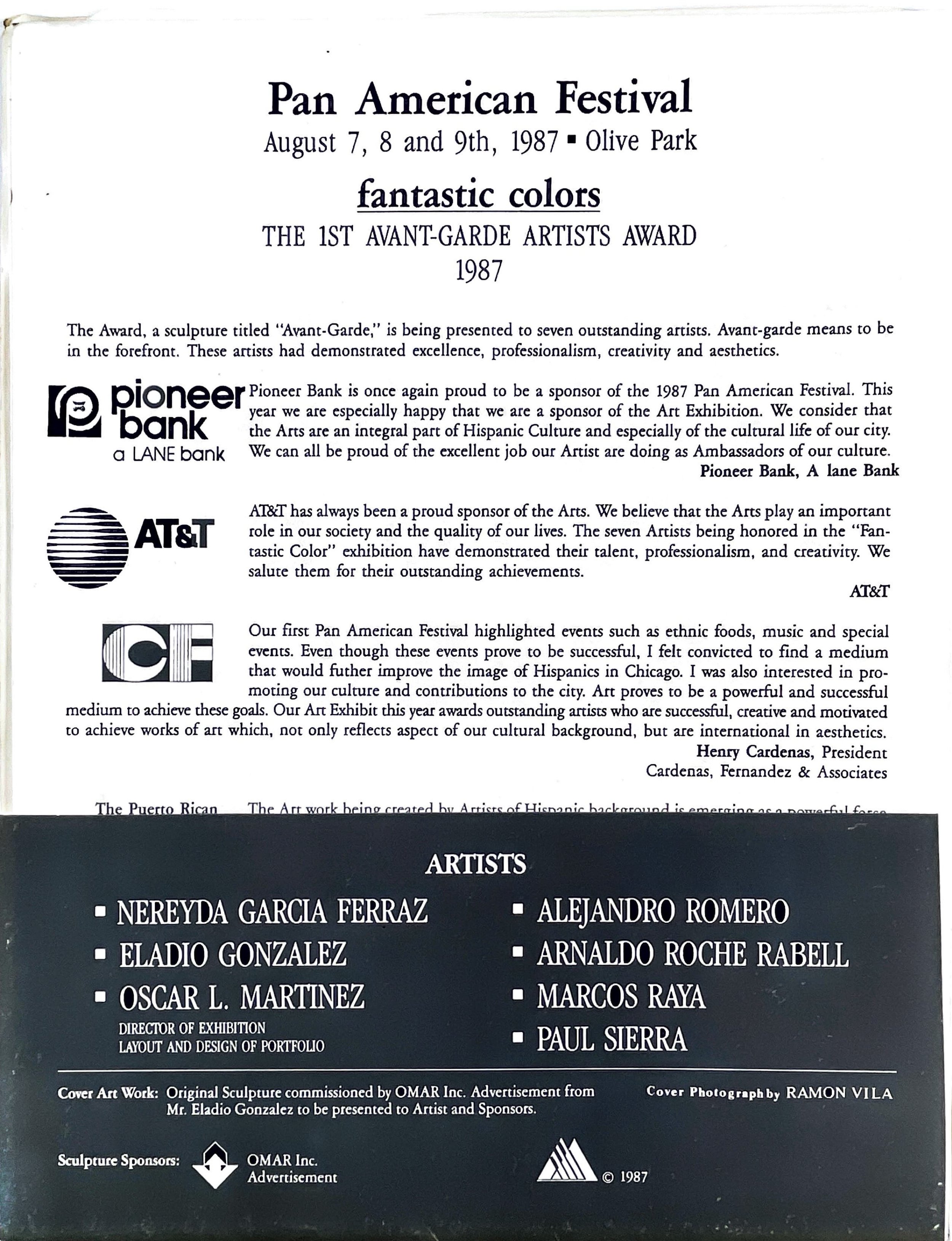 Pan American Festival, 1987 • Olive Park Fantastic Colors Catalogue with artists Nereyda García Ferraz, Eladio Gonzalez, Oscar L Martinez, Alejandro Romero. Arnaldo Roche Rabell, Marcos Raya and Paul Sierra.